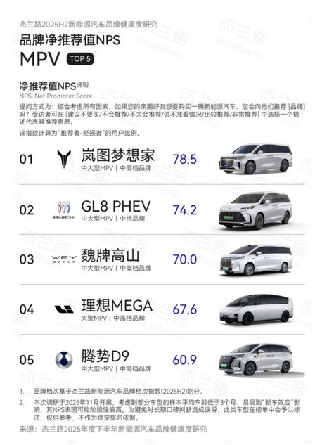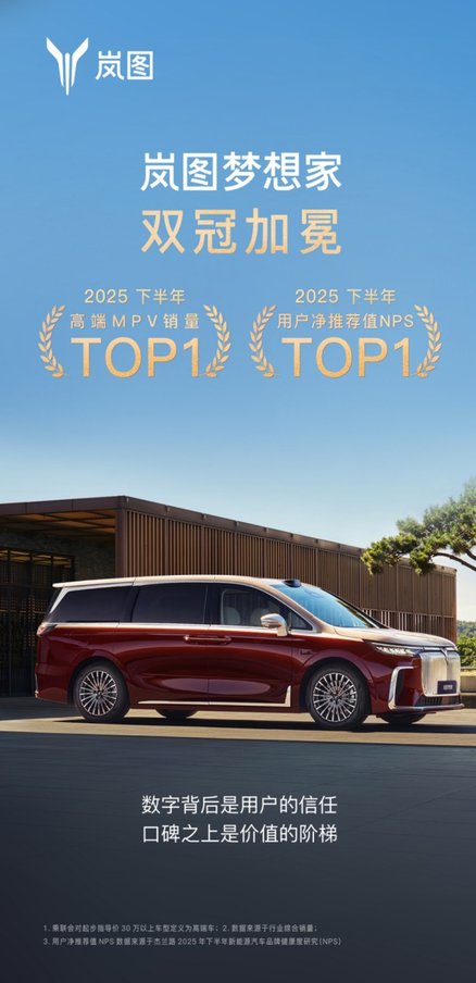 1月10日数据显示,岚图梦想家在2025年下半年销量为43191台,再次蝉联高端MPV第一,2025全年达到80248台,同比增长46%。另据杰兰路发布的《2025年度下半年新能源汽车品牌健康度研究(NPS篇)》,岚图梦想家在2025年下半年以78.5分的净推荐值(NPS)位居新能源MPV榜首。作为豪华旗舰MPV,岚图梦想家在2024年、2025年连续蝉联MPV用户净推荐值第一,成为销量与口碑的“双料冠军”,持续引领中国高端MPV。