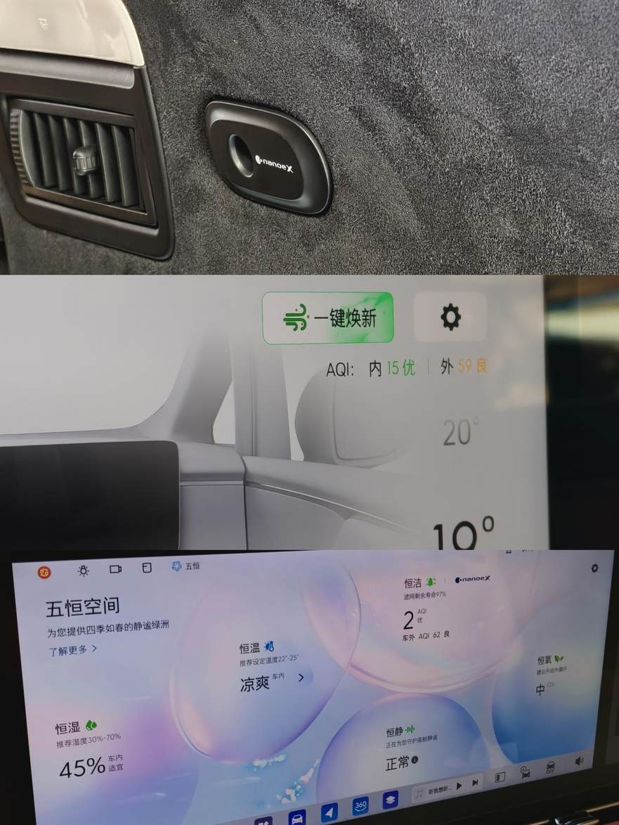而位于第二排屏幕左侧的纳诺怡装置,可让车厢内始终保持40%-60%的最佳湿度区间,能自动控制车载无雾加湿器进行加湿。通过产生纳米水分子,达到保湿润肤效果。避免冬季长途呼吸干燥及皮肤缺水。像我们成都这种冬季空气质量不佳的城市,长时间开空调难免会想开窗换气。