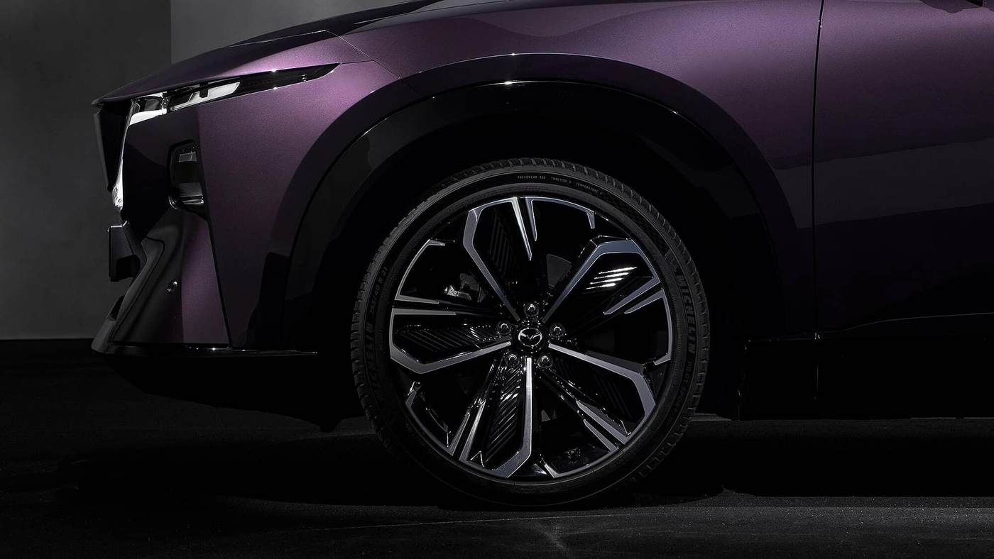 侧面可以看到不少让CX-6e显得独特的细节,比如印有品牌字样的侧裙、完全隐藏在车身里的门把手、D柱上的空气通道以及可选装为向后摄像头形式的外后视镜。在被黑色饰板包围的轮拱中,根据配置不同,搭载19或21英寸轮圈。车顶始终为黑色涂装——即便CX-6e 并非选择“曜黑”,而是六种其他颜色之一。