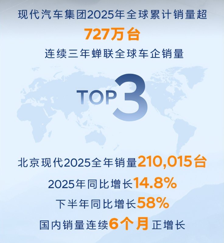 刚结束的北京现代媒体年会上,当210015台的2025年销量数字公布时,现场的人都非常意外,要知道这个数,在2025年合资车企集体承压的大环境里,着实够亮眼。更让人意外的是一串连带数据:全年同比增长14.8%,下半年直接飙到58%,国内销量连续6个月正增长,并且现代汽车连续三年蝉联全球车型销量TOP3。在国内汽车市场新能源冲击、价格战内卷的双重挤压下,这个曾经的“合资顶流”不仅稳住了阵脚,还跑出了转型后的加速度。