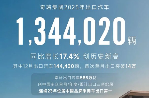 2025年,奇瑞的出海业绩达到了新的历史峰值:全年出口134.4万辆,同比增长17.4%。这意味着,平均每23秒,就有一辆“奇瑞造”驶向海外。“连续23年中国品牌乘用车出口第一”,这不仅仅是一个称号,更是一笔沉甸甸的资产,是长达二十余年搭建的渠道、品牌、供应链和本地化运营能力的总和。
