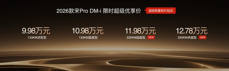 此次,2026款秦PLUS DM-i三款车型售价7.98万元-9.98万元;2026秦L DM-i四款车型限时超级优享价9.28万元-12.28万元;2026款宋Pro DM-i限时超级优享价9.98万元-12.78万元。