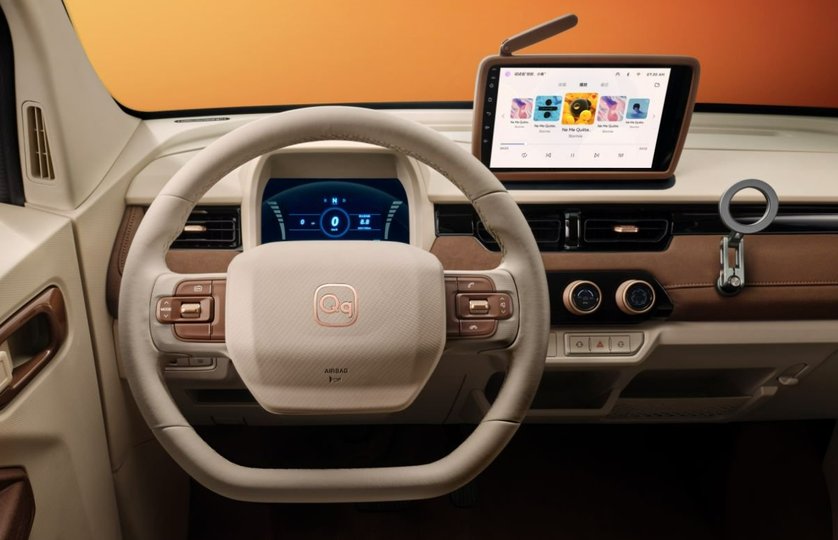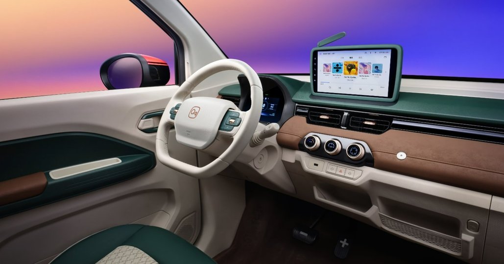 内饰部分,新款QQ冰淇淋显著提升了质感表现,改变了以往微型代步车普遍存在的塑料感较强的问题。女王版采用深咖色与象牙白双拼内饰,竞速版则以深咖色为基底,搭配亮眼绿点缀,从视觉上摆脱了廉价感。车内大面积采用皮质与麂皮材质包裹,辅以玫瑰金饰条装饰,触感细腻;座椅采用格纹面料设计,视觉精致度与乘坐包裹性均有提升,可缓解长时间驾驶的疲劳感。