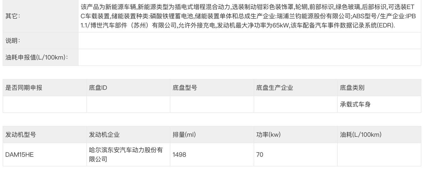 动力部分,采用东安动力的1.5L增程器,最大功率70kW,27.8kWh的瑞浦兰钧的磷酸铁锂蓄电池,WLTC工况纯电续航里程178公里。