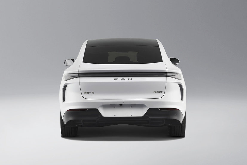 整车的外观较有动感,犀利的大灯下方配有獠牙状的灯带。纯电版和增程版都采用了封闭式前脸设计。不过增程版车型的底部,考虑可能是可开合的进气口。车门采用半隐藏式门把手,预计将符合最新的国标。车尾采用贯穿式尾灯,并配以FAW的品牌字母。