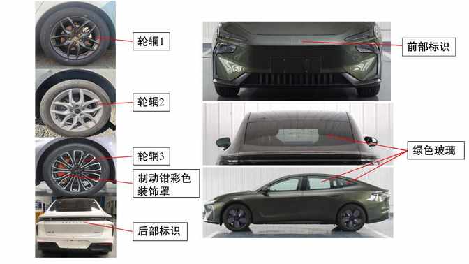 可见配置部分,有18寸和19寸两种型号轮毂,三种样式轮毂带一种橙色制动钳装饰罩,车尾多字母标识,后排及车尾绿色玻璃。
