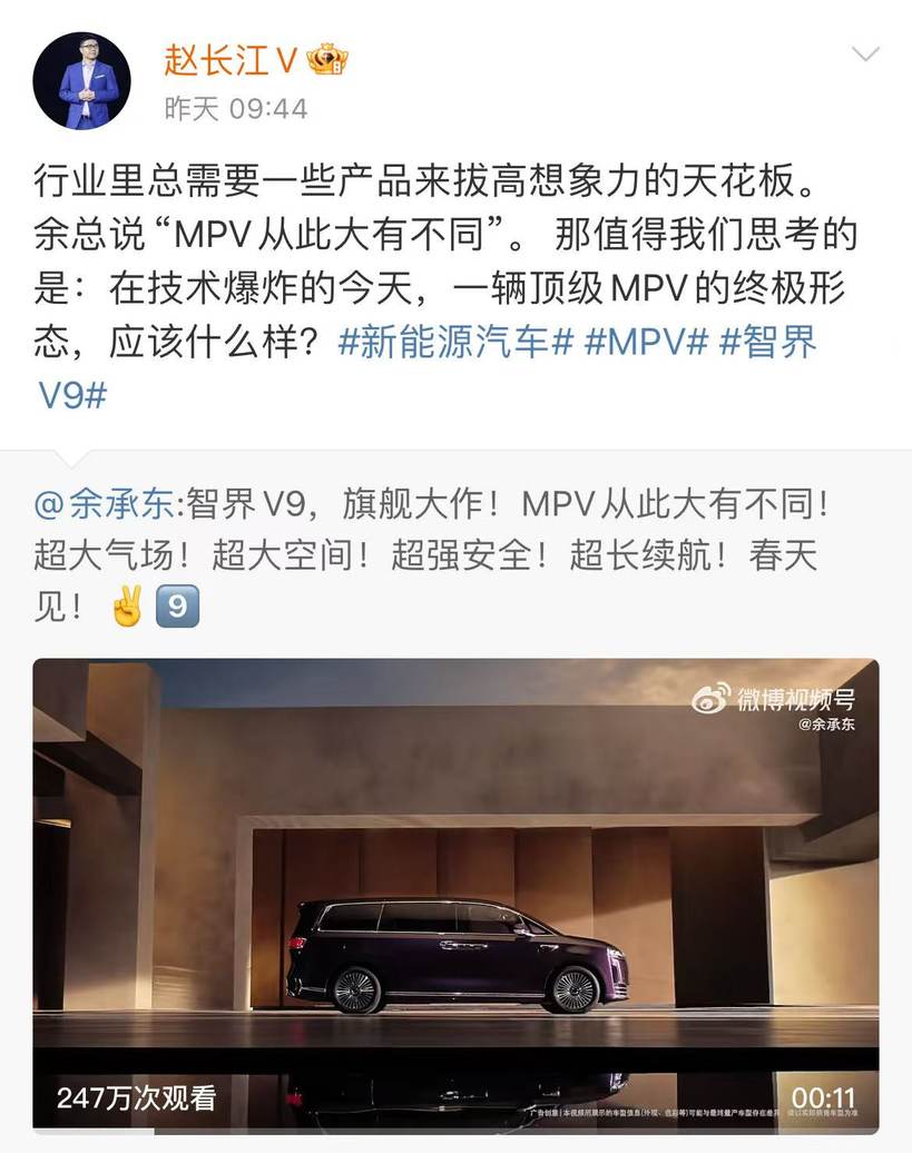 余承东一则智界V9官宣的消息,打破了智界汽车持续数月的沉寂。更炸裂的是紧随其后,前比亚迪高管赵长江转载了这则内容,并配文“在技术爆炸的今天,一辆顶级MPV的终极形态,应该什么样?”