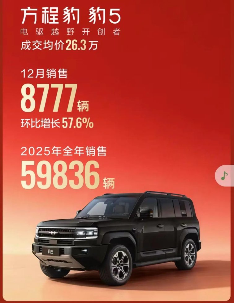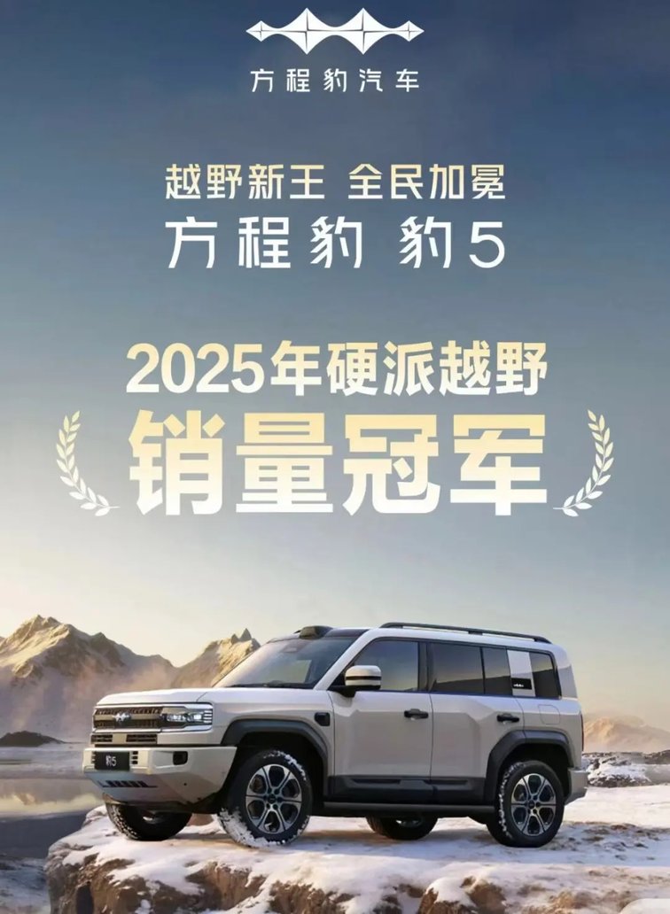 随后方程豹也亮出战绩:2025年硬派越野SUV销量冠军,全年销量59836辆。
