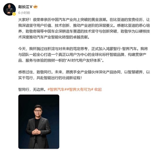1月13日,赵长江通过个人社交平台官宣加入智界汽车,担任执行董事及执行副总裁。作为曾在比亚迪体系拥有任职经历的高管,这一任命被业内解读为智界冲刺高端市场的关键布局,也让这位具备丰富高端MPV操盘经验的营销从业者,再次跻身中国新能源汽车产业竞争的核心领域。赵长江的此次职业转型,既是个人专业经验的全新实践,也契合鸿蒙智行体系完善发展布局、剑指百万销量目标的战略需求