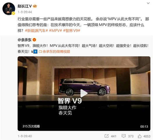 对于智界而言,赵长江可为品牌带来的核心助力,首先体现在高端MPV市场的操盘经验上。2026年春季即将上市的智界V9,作为鸿蒙智行首款50万级中大型豪华新能源MPV,肩负着补齐产品矩阵、提升品牌形象的双重使命。赵长江在转发余承东预热微博时曾提及,智界V9“保守估计三年内没有对手”,展现出对产品的信心。