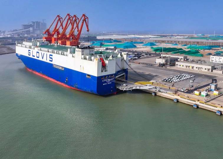 一辆辆汽车驶进滚装船