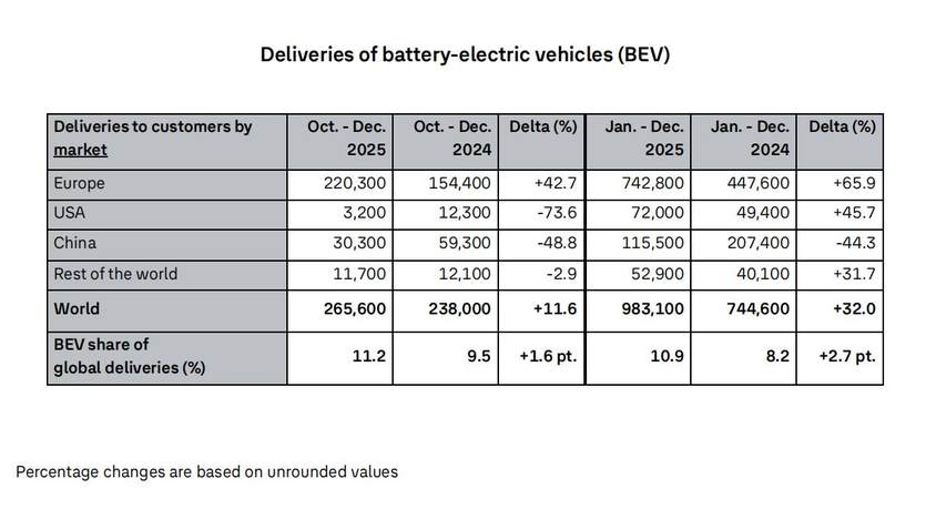 纯电车型贡献98.31万辆,同比增长32%,在集团全球销量的占比达到10.9%,同比提高2.7个百分点。其中,纯电车型在欧洲市场表现尤为亮眼,累计销量达74.28万辆,同比大幅增长65.9%。
