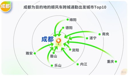 此外,德阳-成都、眉山-成都这两条线路的顺风车通勤规模也位居全国前列,分列顺风车跨城通勤热门往返线路的第14和第22。