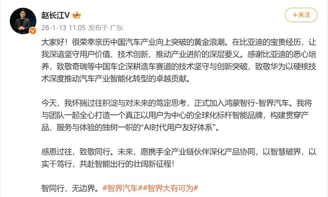 1月13日上午,赵长江在自己的官方微博上正式宣布加入“鸿蒙智行-智界汽车”,而他的职务,比之前传言的“总经理”还高——智界汽车执行董事和执行副总裁。