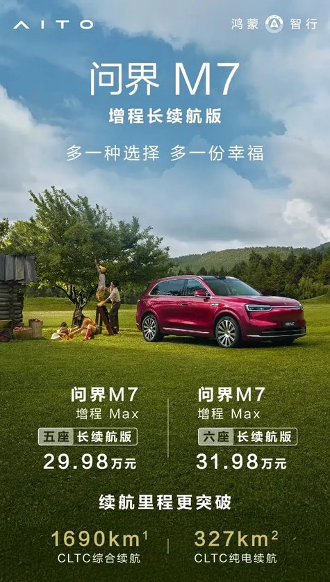 问界M7增程长续航版上市,售价29.98-31.98万元