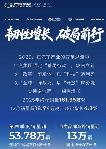 数据显示:2025年12月,广汽集团销量超过18.74万辆,环比增长4.3%;第四季度销量53.78万辆,与第三季度相比增长25.26%,这已经是广汽连续3个季度销量实现环比正增长。