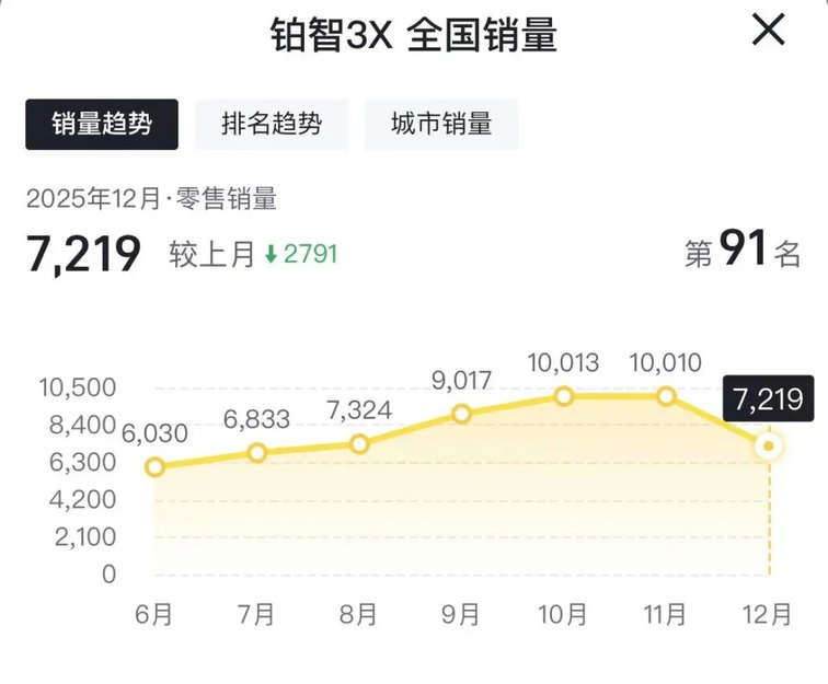 榜单首位由广汽丰田铂智3X斩获,12月销量7219辆。作为合资新能源阵营的热门标杆车型,该车此前已连续两个月销量破万,凭借越级的智能配置与宽敞实用的空间布局,精准契合家庭用户的核心需求,成功积累了大量忠实拥趸。