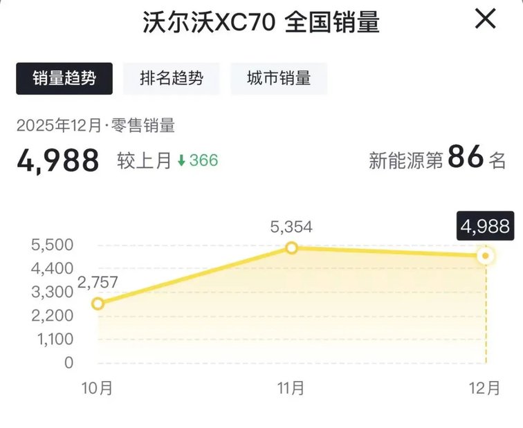 第三名沃尔沃XC70收入囊中,12月销量4988辆,环比11月份销量跌366辆。
