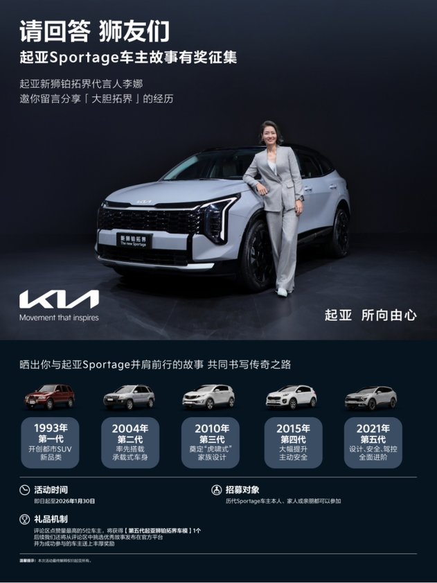 目前,起亚狮铂拓界车主故事有奖征集活动已正式开启,新狮铂拓界代言人李娜向你发出诚挚邀约,期待与你一同回望和狮铂拓界有关的故事。即日起至2026年1月30日期间,历代狮铂拓界车主本人、家人或亲朋均可参与,我们期待收到属于你的独家故事。