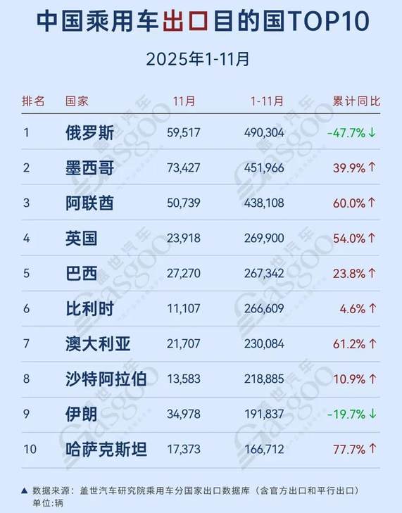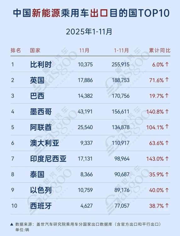 另外,中东市场异军突起,成为年度最大亮点。阿联酋、沙特阿拉伯等国凭借旺盛的购买力和对新能源、智能化产品的极高接受度,跻身中国汽车出口目的地前列。与此同时,拉丁美洲、亚洲的东南亚及澳新市场也持续增长,而以比利时、英国为代表的欧洲市场,同样是中国新能源汽车出口的核心区域。