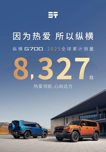近日,纵横公布了旗下全领域豪华越野SUV——纵横G700的销量成绩单,2025年全球累计销量达8327台,这亮眼成绩,为上市首秀交出了完美答卷,在 30-50 万元豪华硬派越野细分市场中脱颖而出,用实打实的销量印证了市场认可度。