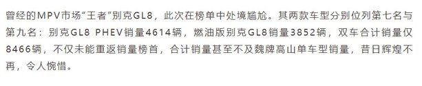 再看12月份别克GL8的实际表现,新能源销量4614辆,燃油车销量3852辆,合并在一起就是8466辆,也确实跌出了前三名,但没有跌出前十名。