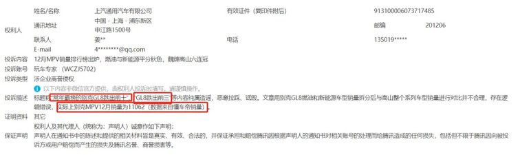 首先,先看投诉内容,上汽通用有限公司投诉描述:标题称常年霸榜的别克GL8跌出前十,别克GL8跌出前三等内容纯属造谣,恶意拉踩,诋毁。还有把别克GL8燃油车和新能源车分开与高山整个系列对比并不合理,存在逻辑错误,实际上别克MPV12月份销量11062辆(数据来自懂车帝销量)。