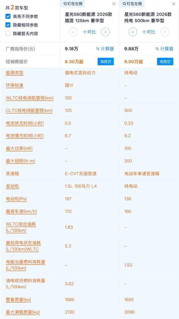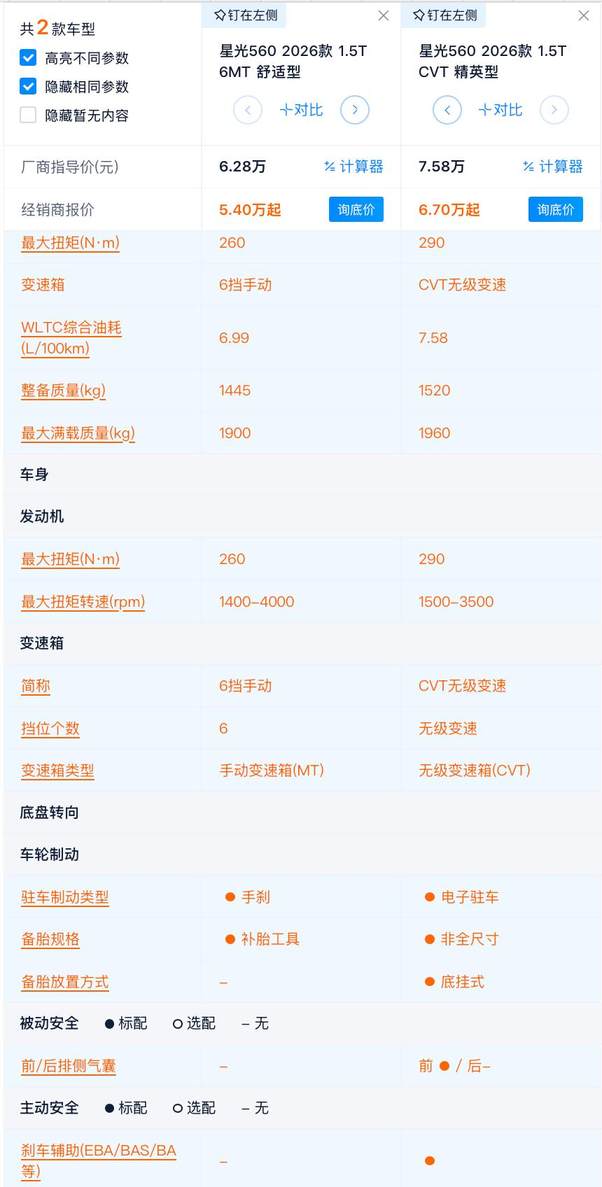 补贴后5.98万起 星光560各款之间有何差异?为什么要买燃油版?