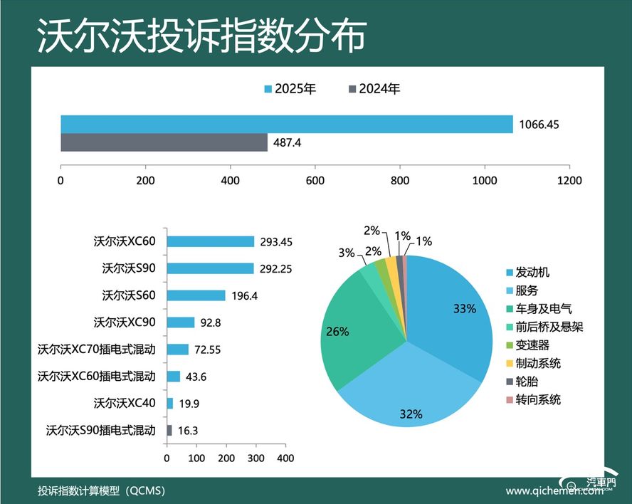 汽车质量投诉点评:2025年,沃尔沃的投诉指数为1066.45,同比上升118.8%。沃尔沃的典型投诉问题为发动机故障灯亮和不退订金。其中,发动机故障灯亮是投诉量最大的问题。沃尔沃XC60和沃尔沃S90是该问题的高发车型。部分沃尔沃车主反馈,沃尔沃官方将凸轮轴从进口原件改为国产部件,此举造成凸轮轴普遍存在质量问题,进而导致车辆发动机故障灯亮。对此,部分沃尔沃车主反映,沃尔沃官方和4S店以车辆超出质保期为理由,拒绝处理该问题。沃尔沃厂家回复称,企业已收到信息,正在尽快跟进。但至今沃尔沃官方也未给出合理的解决方案。