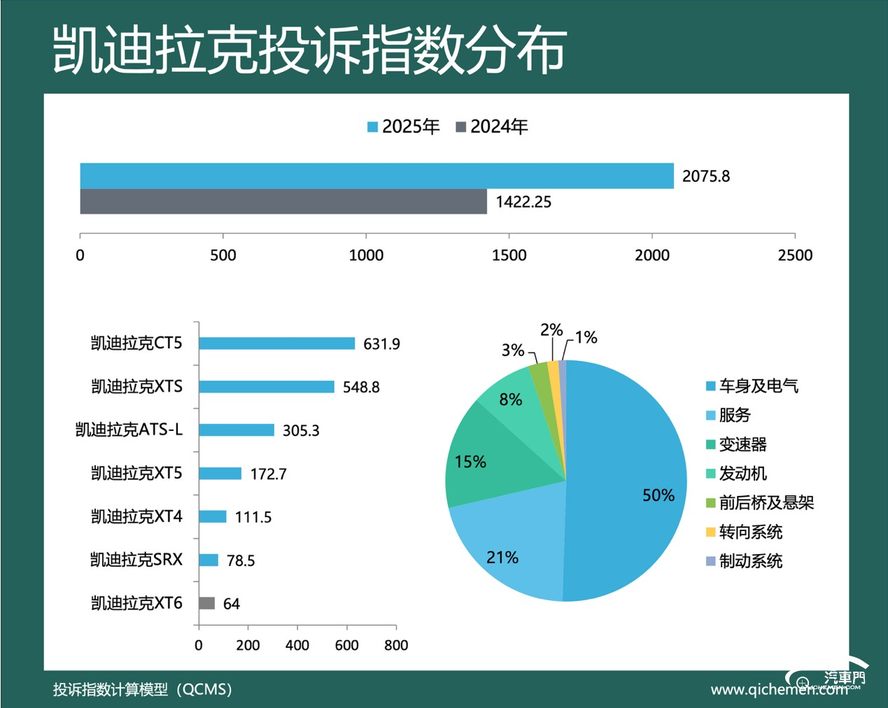 汽车质量投诉点评:2025年,凯迪拉克的投诉指数为2075.8,同比上涨45.95%。中控屏幕失灵开裂、变速箱阀体故障是凯迪拉克被集中投诉的主要问题。凯迪拉克CT5、凯迪拉克XTS、凯迪拉克ATS-L是车主投诉的主要车型。其中,许多凯迪拉克XTS和凯迪拉克ATS-L的老款车车主投诉称,车辆的中控屏幕出现触摸失灵和开裂的问题。部分凯迪拉克车主表示,厂家没有可供更换的对应配件。目前,车主们要求厂家更换故障屏幕。但凯迪拉克厂家回复称,车辆使用年限已超出整车质保期限,因此厂家不予处理。