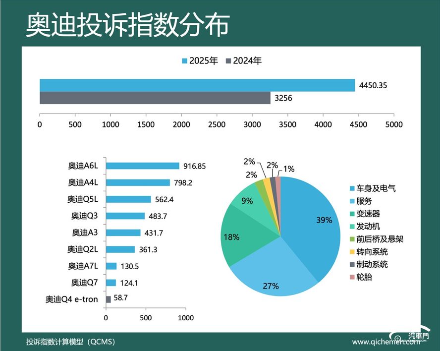 汽车质量投诉点评:2025年,奥迪的投诉指数为4450.35,同比上升36.68%。车身装饰脱落、变速箱机电单元故障和不退订金成为奥迪被集中投诉的主要原因。奥迪Q2L是车身装饰脱落问题频发的车型。大量该车车主投诉称,车辆在行驶过程中C柱饰板掉落,存在较大安全隐患。奥迪车主诉求奥迪厂家免费维修并加固相关部件。