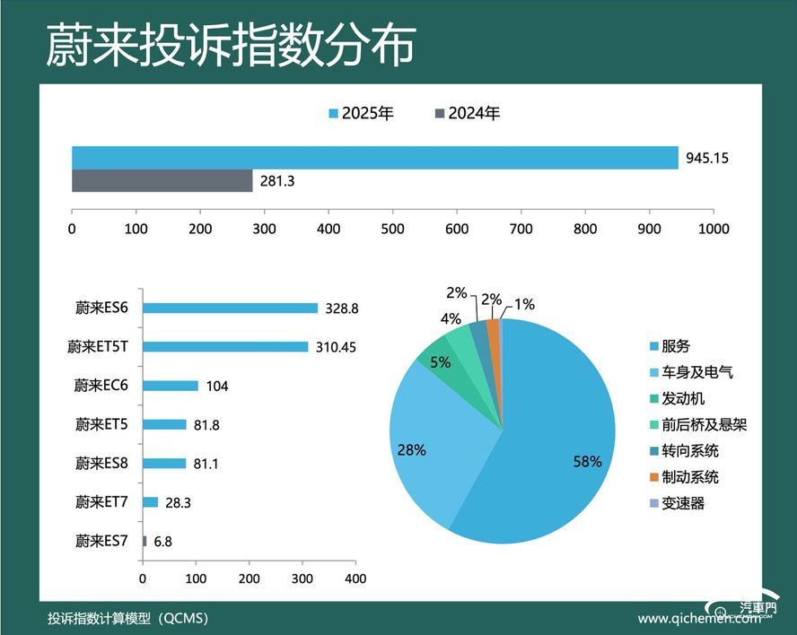 汽车质量投诉点评:蔚来2025年的投诉指数同比上升超两倍,其投诉指数为945.15。短期变相降价、不退订金和驾驶辅助系统故障是蔚来遭到集中投诉的主要原因。其中,短期变相降价问题在去年7月被大量蔚来车主投诉。据蔚来车主反馈,去年4月到5月,蔚来汽车销售人员以“清仓绝版优惠”“新款必涨价”等话术,催促消费者下单蔚来ES6、蔚来EC6等车型。但蔚来汽车却在去年7月宣布降价,导致蔚来汽车部分车型二手车估价缩水数万元。目前,蔚来汽车仍未作出正面回复。