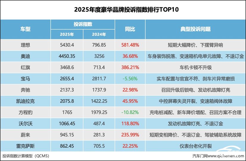 2025年度豪华品牌投诉指数排行:某新势力品牌登顶