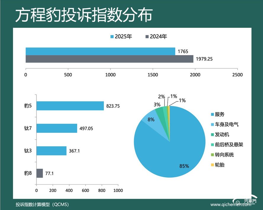 汽车质量投诉点评:2025年,方程豹的投诉指数为1765,同比下降10.82%。充电桩减配、新车降价增配、召回方案不合理是方程豹被投诉的主要问题。其中,充电桩减配是方程豹投诉频率最高的问题。去年10月,方程豹品牌在未告知车主的前提下,对车辆充电桩进行“升级”。新款充电桩不仅外观质感下降,核心功能也被取消。许多方程豹车主反馈,充电桩问题已多次投诉,但方程豹官方至今未给予明确答复。