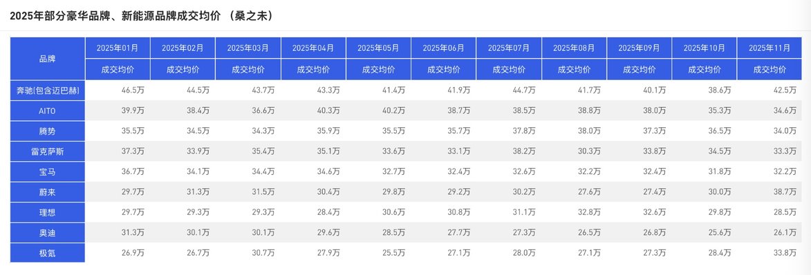 据中国汽车流通协会专家委员会成员李颜伟(笔名“桑之末”)所发布的数据,奔驰在2025年成交均价超过30万元的品牌当中销量依然领先。奔驰在2025年的单月成交均价长期保持在40万元以上,依然明显领先于均价最高的中国品牌问界。