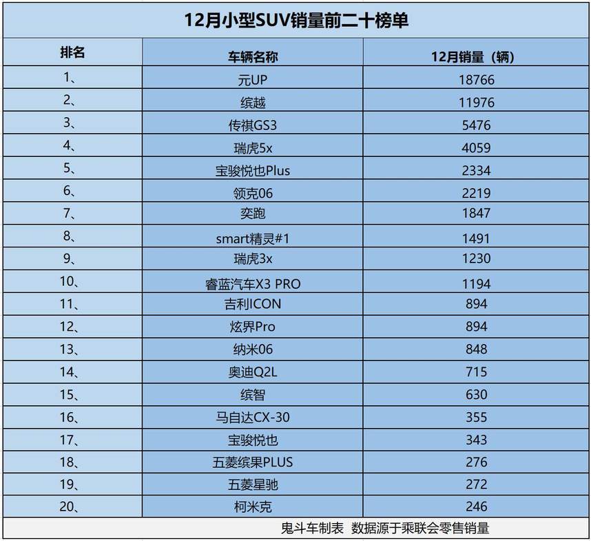 这一点主要体现在销量上,日前,乘联会发布2025年12月零售销量数据,鬼哥整理出12月小型SUV销量排名前二十榜单,结果,榜单上只有两款小型SUV销量过万。接下来,看看具体排名与销量表现。