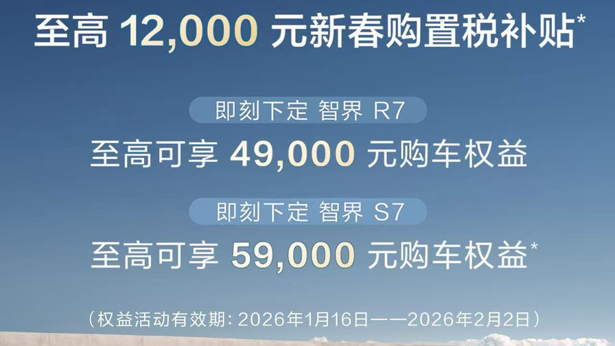 智界给出的政策是,1月16日到2月2日之间,限时可享受最高1.2万元的新春购置税补贴。同时,下定智界R7有最高4.9万元的购车权益,下定智界S7有最高5.9万元的购车权益。