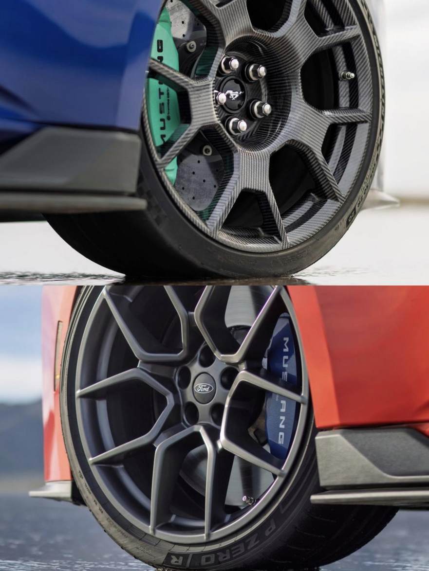 Track Pack配备20寸碳纤维轮毂搭配米其林Pilot Sport Cup 2 R轮胎,前305/30 R20,后315,还有源自GTD上的碳陶制动系统。并且Track Pack性能包还让SC整车减重了68kg,而下压力相比Dark Horse却增加了一倍。