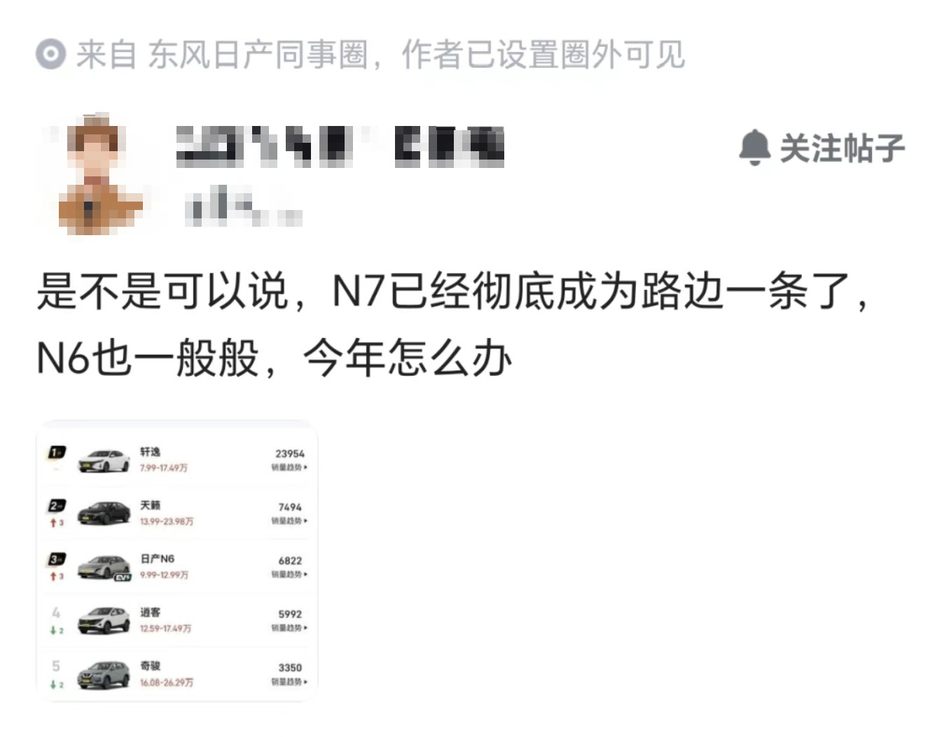 前不久,有条来自东风日产同事圈的帖子表示:“是不是可以说,日产N7已经彻底成为路边一条了,日产N6也一般般,今年怎么办。”