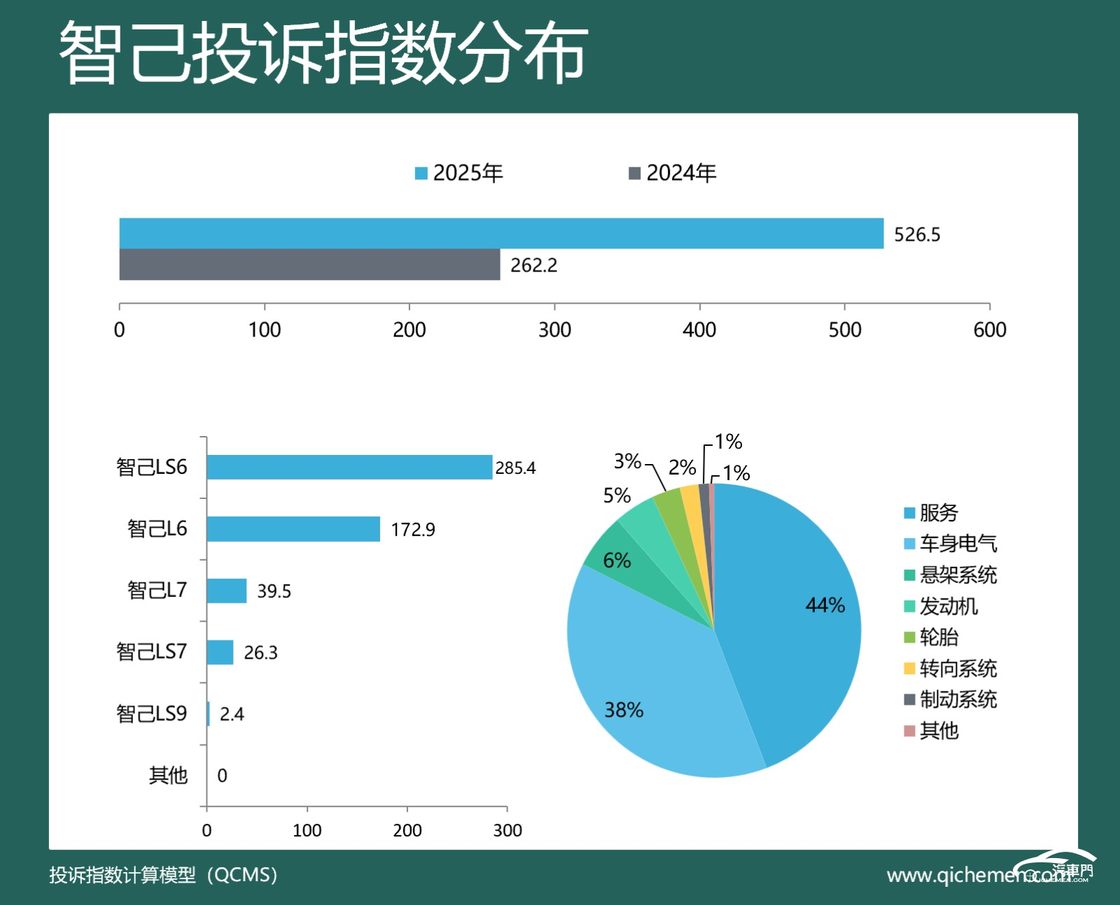 汽车质量投诉点评:过去的一年,智己的投诉指数达到了526.5,同比上涨了101%,经销商不退订金、驾驶辅助故障、悬架吃胎偏磨、空调喷白粉成为上榜理由。从投诉反馈来看,2025款智己L6和智己LS6是经销商不退订金问题的重点投诉车型。驾驶辅助故障具体表现为开启NOA闯红灯、车辆自启动冲出车位、辅助泊车不能识别障碍物等。悬架吃胎偏磨和空调喷白粉也有车主投诉,二者合计投诉占比12%。
