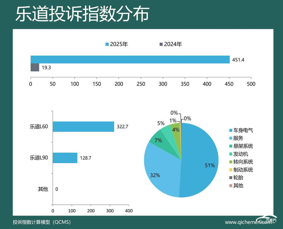 汽车质量投诉点评:2025年,乐道投诉指数同比涨超22倍,经销商不退订金、部件开裂、驾驶辅助故障、座椅故障成为上榜理由。具体来看,乐道L60是经销商不退订金的重点投诉车型,具体表现为经销商违反合同、诱导下订、银行贷款未通过等。乐道L60天幕玻璃出现斑马纹问题,2024款和2025款车型均有涉及。驾驶辅助故障和座椅故障也有车主在投诉,二者合计投诉占比13%。