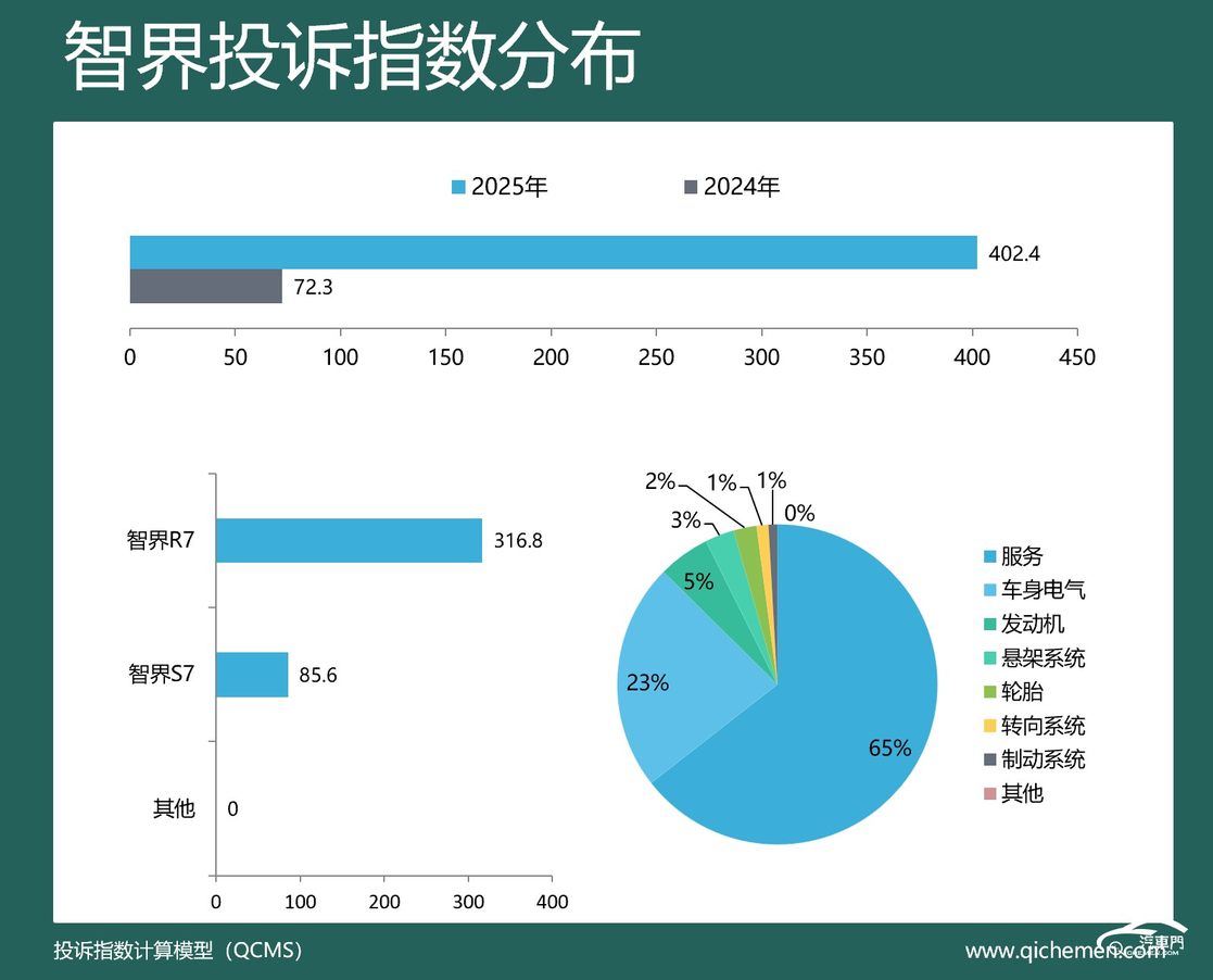 汽车质量投诉点评:去年,智界投诉指数同比涨超4倍,新车降价、订车后权益变更、经销商不退订金是车主投诉的主要原因。去年6月,官方对R7全系推出现金直降2万元的政策,引发了老车主的大规模维权。还有车主表示,购车后官方突然发布对2026款智界R7的新购车权益,原来要花费6000元选装的雀羽红内饰和2000元选装的黑曜套件可以免费选择的同时,官方还赠送价值794元的交付礼包,此举让老车主感到不满。此外,也有部分车主针对经销商不退订金在投诉。