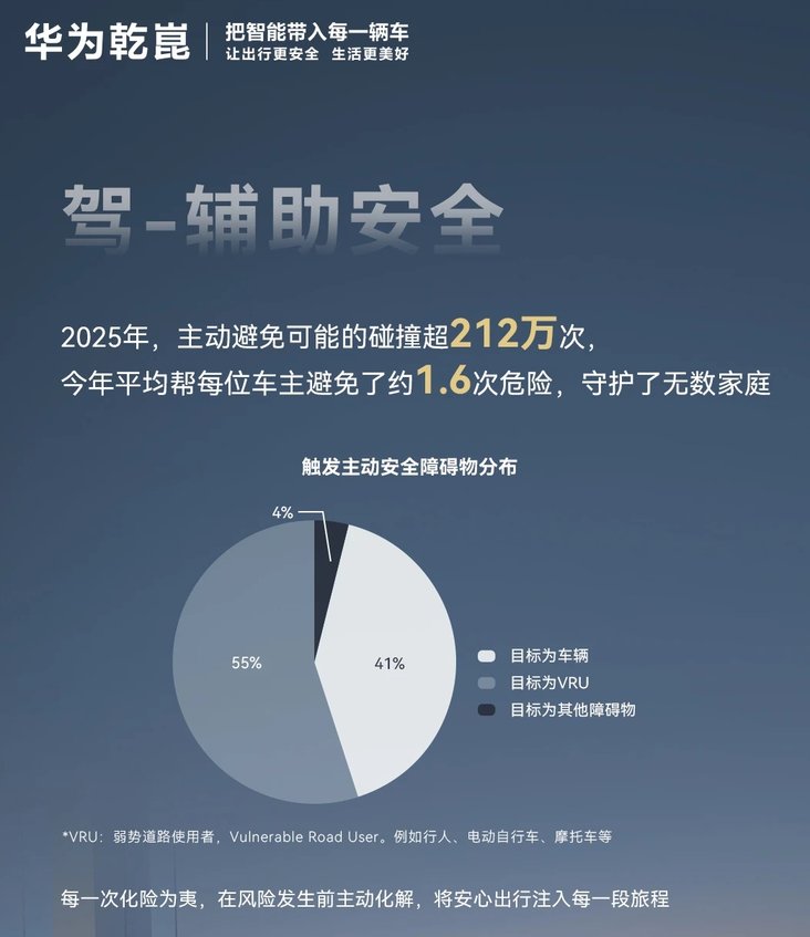 2025年全年时间里,华为乾崑智驾行驶总里程超54.2亿公里,相当于绕地球13.5万圈;辅助泊车使用超3.3亿次;主动避免可能的碰撞超212万次,平均帮每位车主避免了约1.6次危险;活跃用户超130万人……
