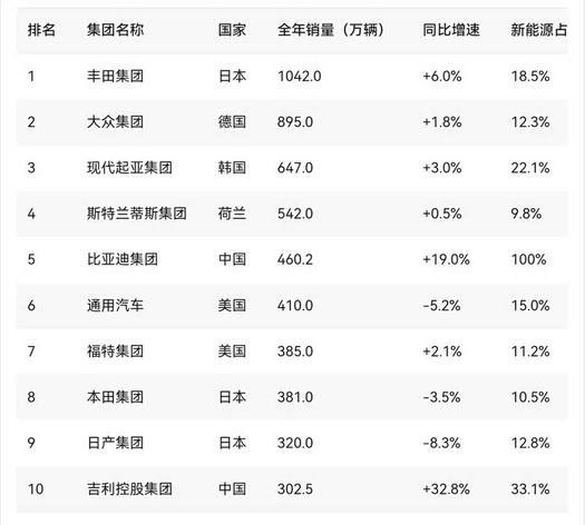 就在这样的喧嚣中,丰田以一种近乎沉默的姿态,交出了一份足以定调格局的成绩单——2025年全球销量达1042万辆,不仅远超老对手大众集团的895万辆,更实现了全球销量六连冠的壮举。