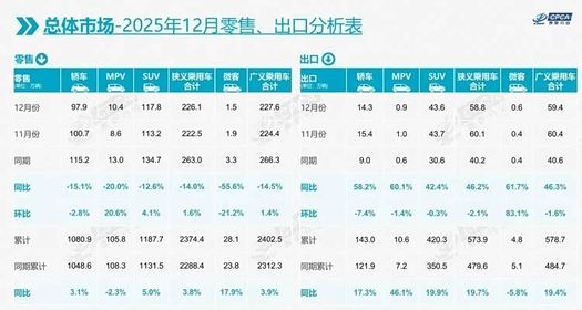 与此同时,12月厂商批发销量278.9万辆,同比下降9%,降幅明显小于零售端的14%。这种“批发降幅小于零售”的现象,恰恰揭示了部分车企仍在向经销商渠道压库的现实,当然也与出口有一定关系。