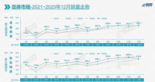 1月9日,乘联分会月度形势分析会发布数据显示,2025年12月,全国狭义乘用车零售226.1万辆,同比下降14%,尽管环比微增1.6%,但整体走势明显趋于平淡。