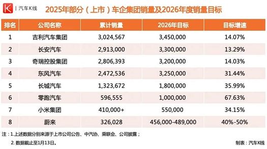 近日,包括东风汽车、吉利汽车、长安汽车、奇瑞汽车、长城汽车、零跑汽车等在内,多家上市车企集团调高(增幅均达两位数)2026年销量目标,这与经销商预期形成明显反差,凸显渠道端与主机厂之间对市场预期的巨大分歧。