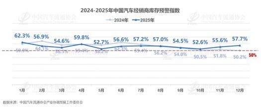 2025年最后一天,中国汽车流通协会(简称“流通协会”)发布了全年最后一期“中国汽车经销商库存预警指数调查”,结果这一直观反映中国汽车流通行业健康度的关键指标升至57.7%,环比上升2.1个百分点,同比大幅上升7.5个百分点。