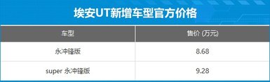 日前,从相关渠道获悉,埃安UT新增两款车型,分别是永冲锋版和super 永冲锋版,官方指导价8.68万-9.29万。