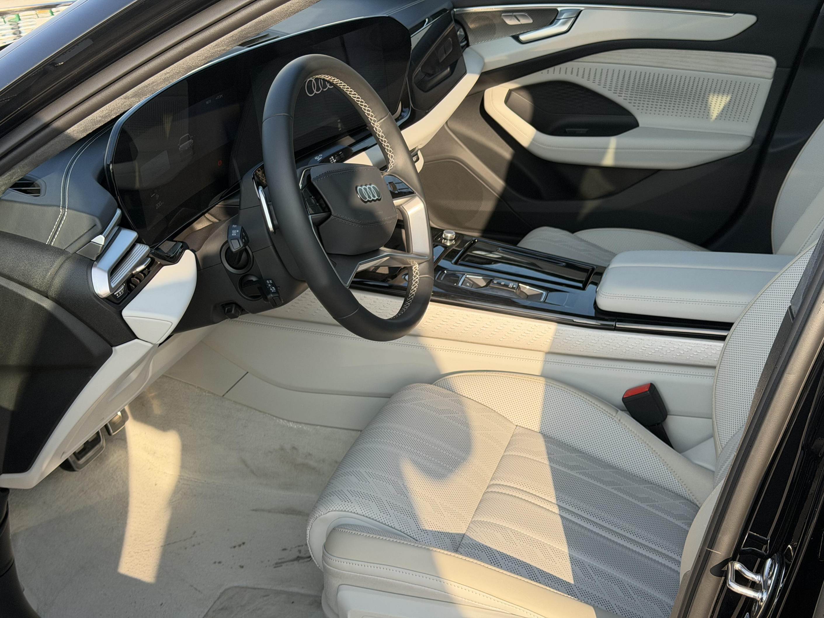 内饰延续了家族最新的环抱式座舱,大尺寸曲面双联屏配合副驾娱乐屏以及W-HUD抬头显示,营造出满满的科技氛围,并搭载奥迪最新互联技术,而得益于搭载了双激光雷达(导风槽内),预计华为乾崑智驾技术也不会缺席。